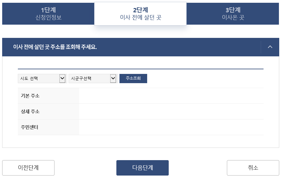 2단계에서는 이사하기 전 살던 곳의 주소를 조회하고 이상이 없다면 다음 3단계로 넘어갑니다.