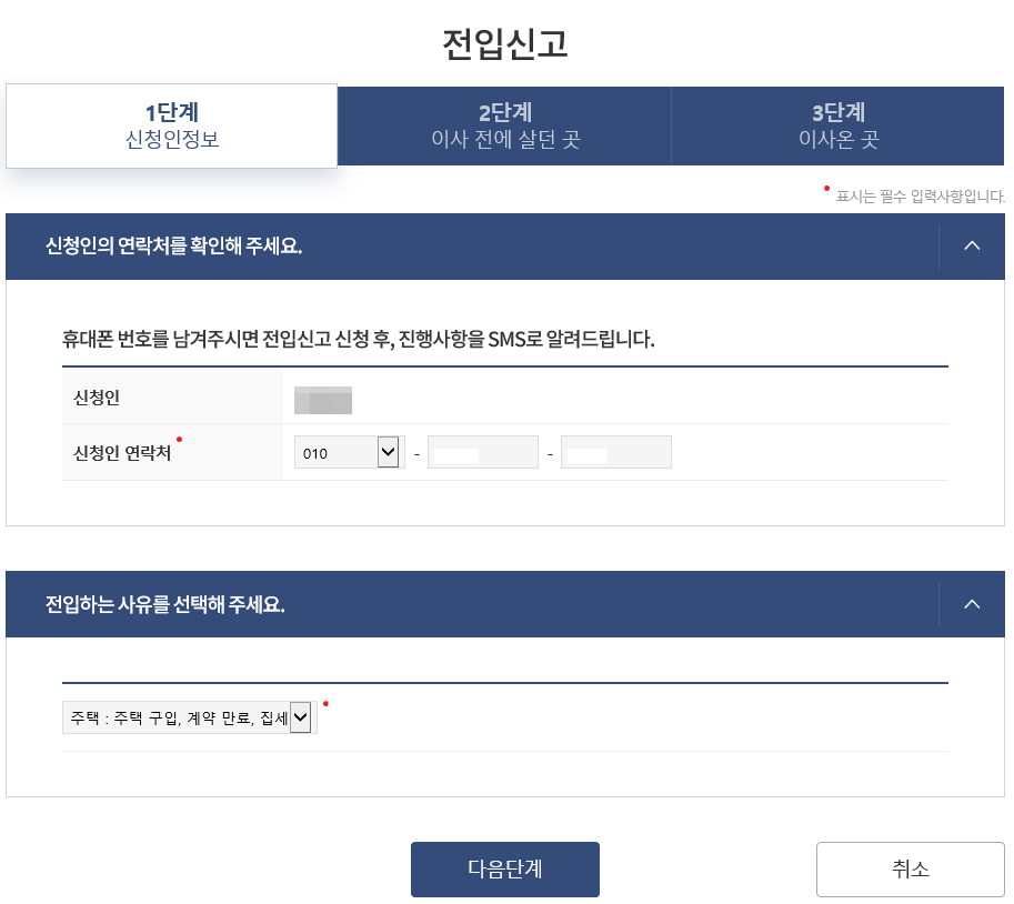 전입신고 1단계로 신청인의 연락처를 포함한 정보를 확인하고 전입 사유를 선택하게 됩니다.