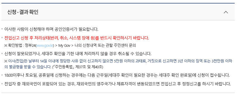 - 미성년자가 포함된 경우 전출지 세대주가 공인인증서를 통해 세대주 확인이 가능한 경우를 제외하고는 인터넷 전입신고 불가