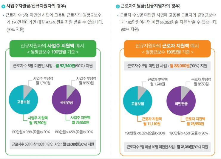 근로자 수가 5명 미만인 사업에 고용된 근로자 월평균보수액이 190만원이라면 사업주는 월 92,340원을, 근로자는 월 88,060원을 지원받게 됩니다. (산정보험료 90%에 해당)