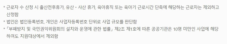 단, 근로자 수 산정시 출산휴가, 유산/사산 휴가, 육아휴직 또는 육아기 근로시간 단축기간에 해당 하는 근로자는 제외하여 산정합니다.