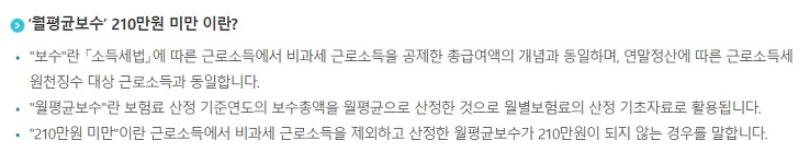 위에서 말한 월평균보수 210만원의 기준은 근로소득에서 비과세 근로소득을 공제한 총급여액의 개념과 같으며, 연말정산에 따른 근로소득세 원천징수 대상 근로소득과도 같습니다. 즉 보험료 산정 기준연도의 보수총액을 월평균으로 산정한 것으로 월별보험료 산정 기초자료로 활용이 됩니다.