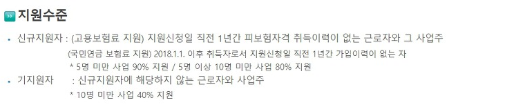 신청에 따른 지원 수준은 지원신청일 직전 1년간 피보험자격 취득이력이 없는 근로자와 사업주의 경우 신규지원자에 해당하여 80% 지원에서 5명 미만 사업장의 경우 90%를 지원받을 수 있습니다. 기지원자의 경우 10명 미만 사업에 한해 40%를 지원합니다.