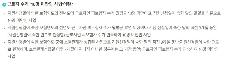 근로자 수 10명 미만 사업을 판단하는 기준은 지원신청일이 속한 보험연도 전년도에 피보험자 수가 월평균 10명 미만이고 지원신청일이 속한 달 말일 기준으로도 근로자 수가 10명 미만이어야 합니다. 또는 전년도 월평균 근로자가 10명 이상이었더라도, 지원 신청일이 속한 달의 직전 3개월 동안 근로자 수가 연속하여 10명 미만인 경우에도 해당됩니다.