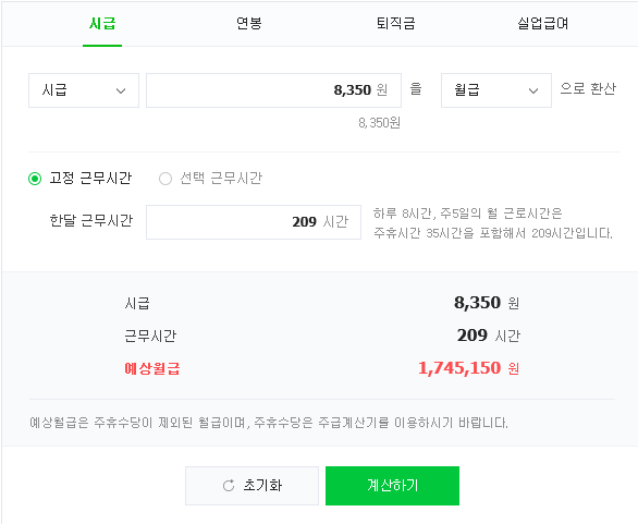 참고로 위는 네이버 월급계산기를 이용했습니다. 시급이 자동으로 입력되고 월급으로 환산하여 계산해보니 예상월급은 1,745,150원이 나오고 이를 계산하는데 적용된 근무시간이 209시간 계산법으로 자동 입력됩니다.