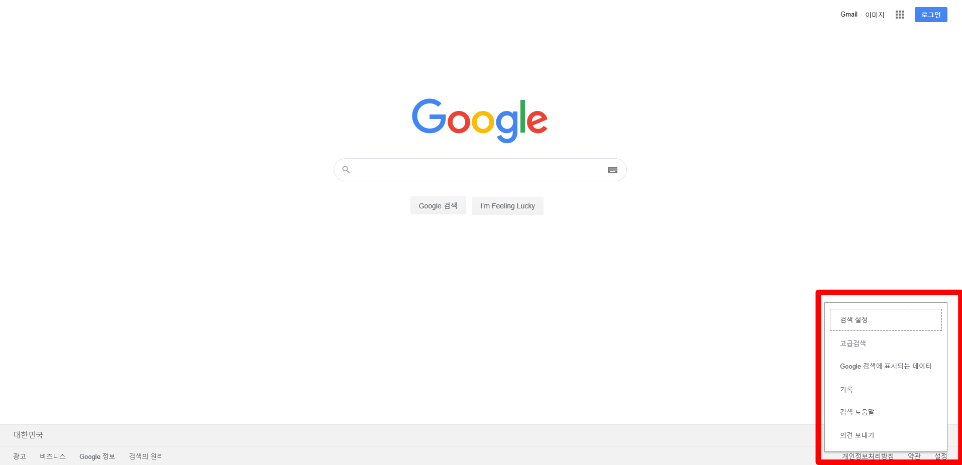구글 메인 홈페이지로 나와서 화면 우측 하단 구석에 보시면 설정이라는 글자가 있습니다. 이 곳을 클릭해주세요.
