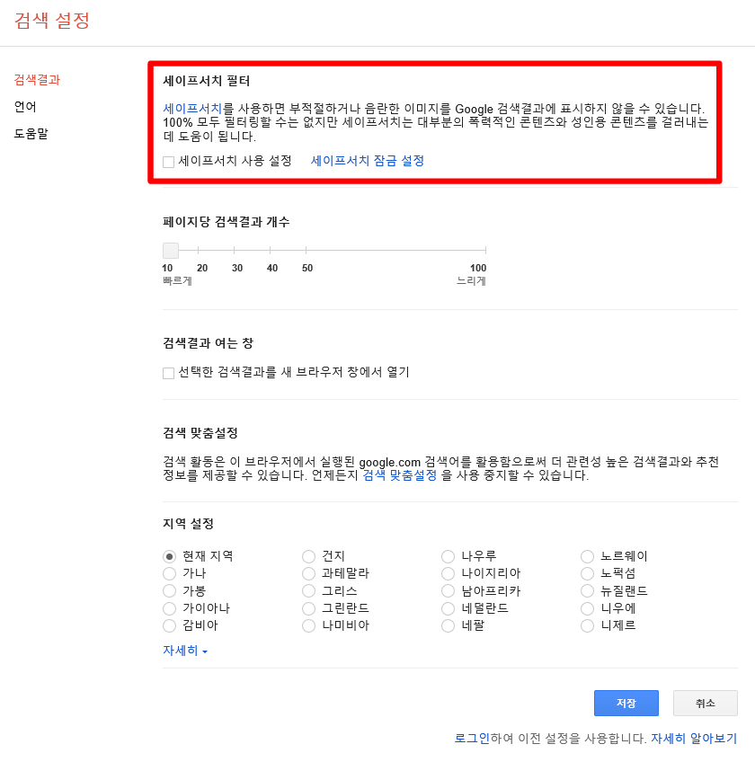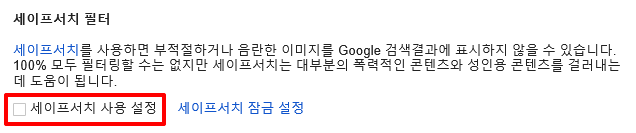 여기에서 세이프서치 사용 설정 옆에 있는 네모 박스에 체크가 되어있다면 박스를 한 번 클릭해서 체크를 없앤 상태로 저장을 해주면 세이프서치를 해제할 수 있습니다.