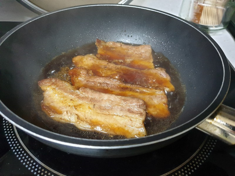 끓이던 소스가 살짝 졸여지면 삼겹살을 소스에 그대로 넣어줍니다. 불을 살짝 줄이고 삼겹살에 소스 간이 배도록 함께 졸입니다.