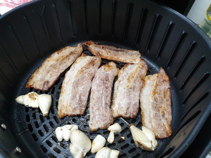 저는 돈까스 대신에 삼겹살을 준비했습니다. 시간에 맞춰서 에어프라이어로 미리 돌려서 익혀놨어요.