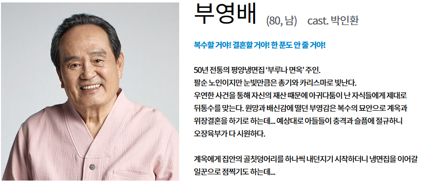 드라마 기막힌 유산의 극중 인물관계도는 크게 이 세 인물을 중심으로 이루어져있습니다. 극중 부영배와 부설악은 아버지와 아들 관계이고 공계옥은 부영배의 재산문제로 인해 부영배와 위장결혼을 하여 부영배의 집안에 새엄마로 들어가게 되는 역할입니다. 극중 나이를 보면 현실적으로 받아들이기 어려운 다소 억지스러운 설정이라는 느낌이 들기는 합니다.