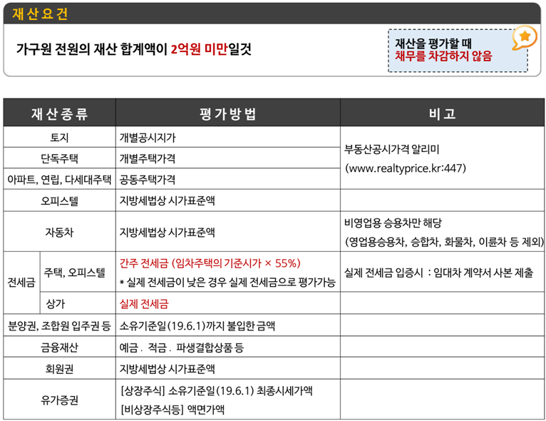 근로장려금 신청자격에는 재산요건도 포함이 되는데 가구원 전체의 재산 합계액이 2억원을 넘어서는 안됩니다. 재산의 종류에 따라 평가 방법이 각각 다르기 때문에 해당하는 기준에 맞춰 재산을 계산해봐야 합니다.