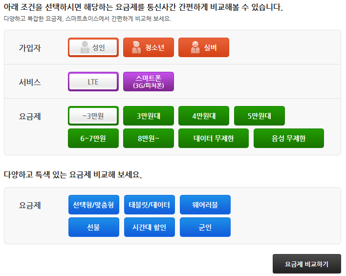 요금제에도 선택형, 맞춤형, 데이터 요금제, 시간대 할인, 선불 요금제등 다양한 요금제를 출시하고 있기 때문에 각자 패턴에 맞는 요금제와 희망하는 요금대를 골라서 요금제를 비교해볼 수도 있습니다.