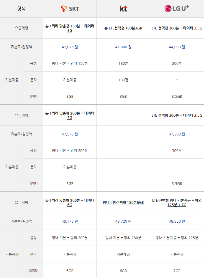 위처럼 비슷한 금액대에서 통신사 3사에서 제공하는 비슷한 유형의 요금제를 알아서 보여주기 때문에 한꺼번에 요금제 비교하기가 매우 편합니다. 표에서 볼 수 있듯이 비슷한 금액대의 요금제에서도 제공하는 기본 음성통화량과 데이터 제공량이 조금씩 차이가 나는 걸 알 수 있습니다.