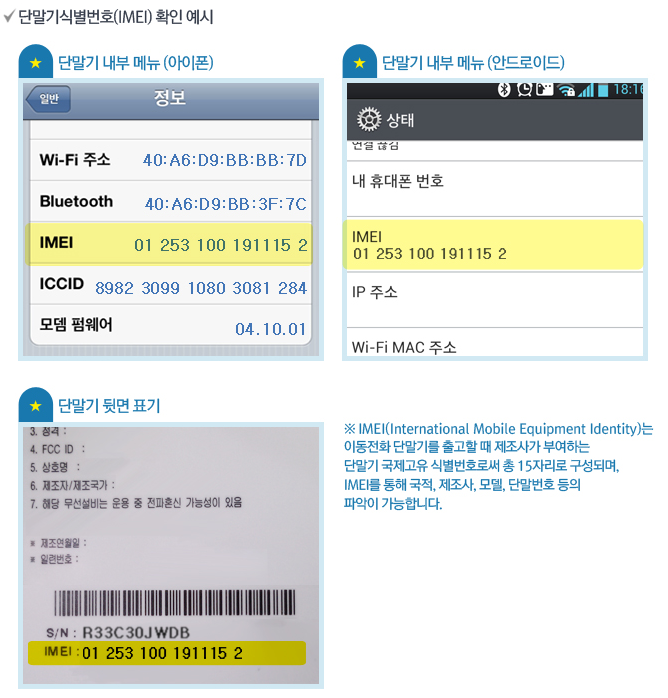 그보다 이전에 출시된 3G 단말기나 휴대폰의 IMEI 번호를 모를 경우에는 모델명 또는 기기 일련번호로도 조회가 가능합니다. 단, 엘지유플러스 LTE단말기의 경우 IMEI로만 조회가 가능합니다.