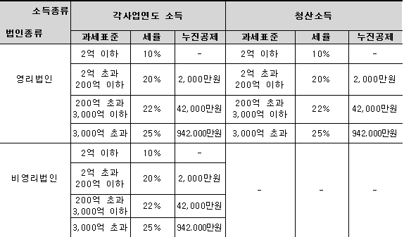 2018년 이후 과세표준 3000억원 초과 구간이 신설되면서 법인세 최고세율이 22%에서 25%로 인상되었고, 2020년 법인세 세율은 총 4단계 누진세율 구조로 되어있습니다.