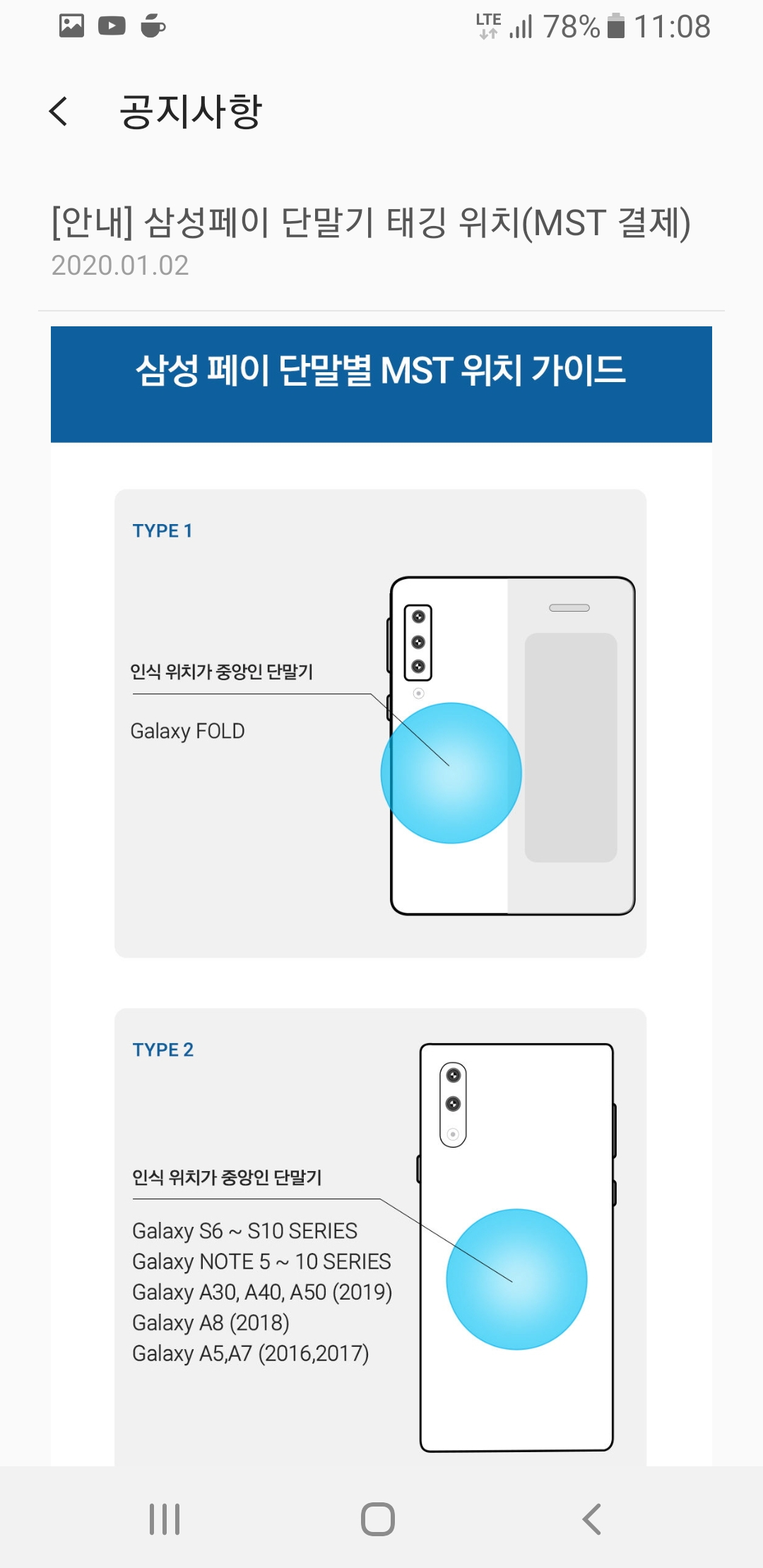 최근 출시된 갤럭시 폴드부터 갤럭시 S6 이후 갤럭시 노트 10까지, 그리고 A30, A40, A50, A8 외 기종의 경우 대부분 후면 중앙부를 갖다 대면 삼성페이 인식이 됩니다.
