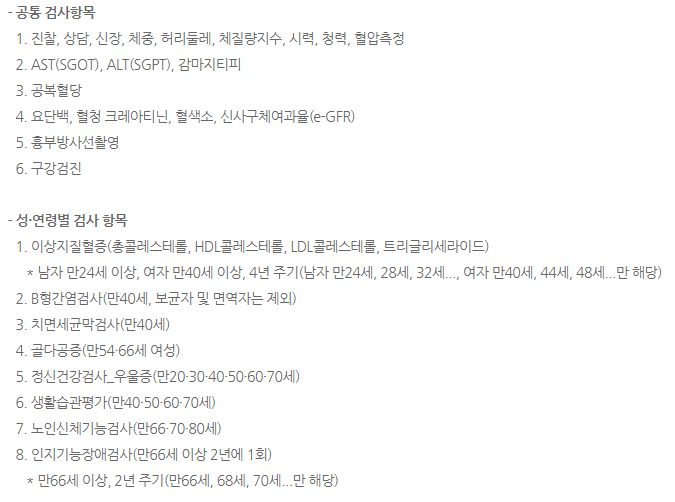 건강검진시 기본 검사항목은 위와 같습니다. 정해진 검사 외에 추가로 필요한 검사가 있을시 따로 검진기관에 문의를 해보셔야 합니다.