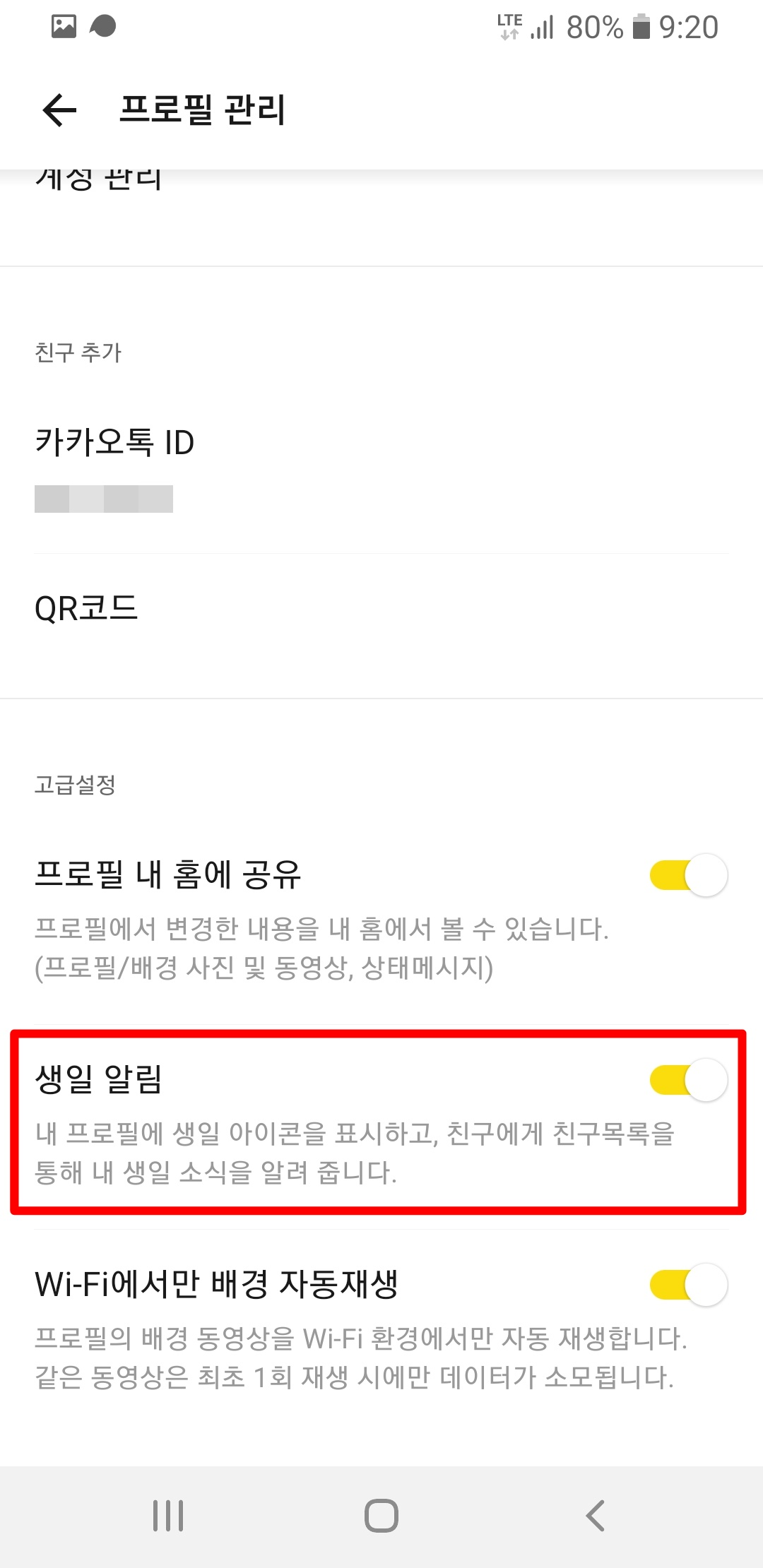 3. 프로필 관리 화면에서 아래로 내려보면 '생일 알림' 메뉴가 보이는데, 이 곳 설정을 꺼주면 더 이상 내 생일이 카톡 친구들에게 보이지 않게 됩니다.