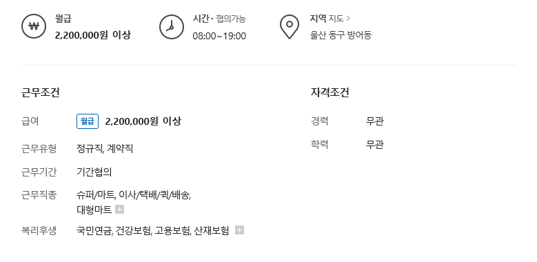 원하는 구인정보를 클릭해보면 자세한 급여액과 근무형태, 근무 기간 등 근무 조건을 확인할 수 있고 요구하는 경력이나 학력 사항에 대해서 자격 조건도 확인이 가능합니다. 대부분 공고를 낸 회사의 규모나 정보에 대해서도 공개를 하고 있구요.