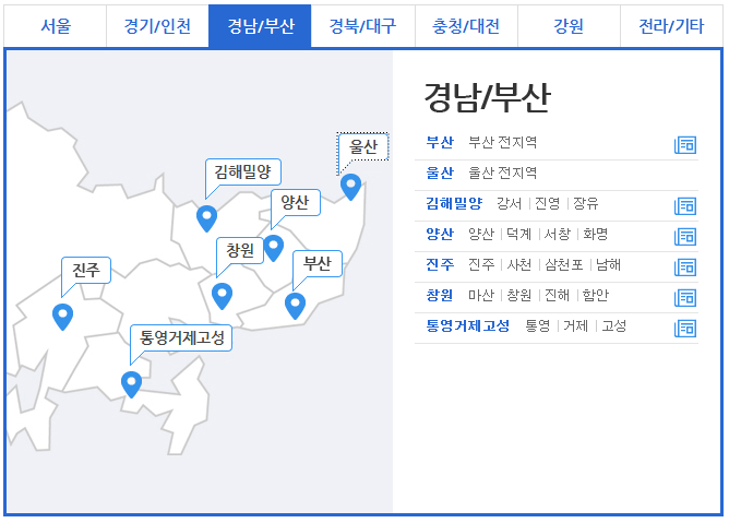 벼룩시장 사이트로 접속하면 전국의 모든 지역을 대상으로 구인구직 정보를 얻으실수 있습니다. 울산지역 정보를 알아보기 위해 경남/부산으로 들어가서 울산을 선택해보겠습니다.
