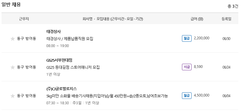 이렇게 검색을 희망하는 지역과 직종을 선택하고 검색하기 버튼을 누르면 조건에 맞는 구인정보 결과를 보여주게 됩니다.