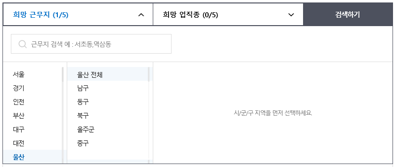 다음으로 울산 내에서 구인구직 검색할 지역을 선택해줍니다. 지역 선택은 최대 5곳까지 선택이 가능합니다.