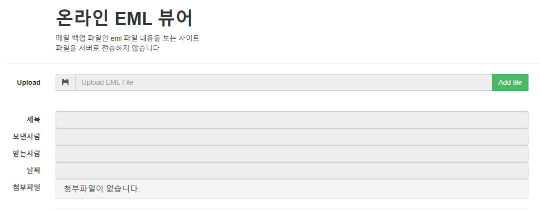 깃허브에 등록된 사이트로 eml 파일을 별도 프로그램 설치 없이도 간단하게 웹에 파일을 업로드하는 것만으로 제목, 보낸사람, 받는사람, 날짜, 첨부파일까지 간단하게 eml 파일을 열어볼 수 있습니다.