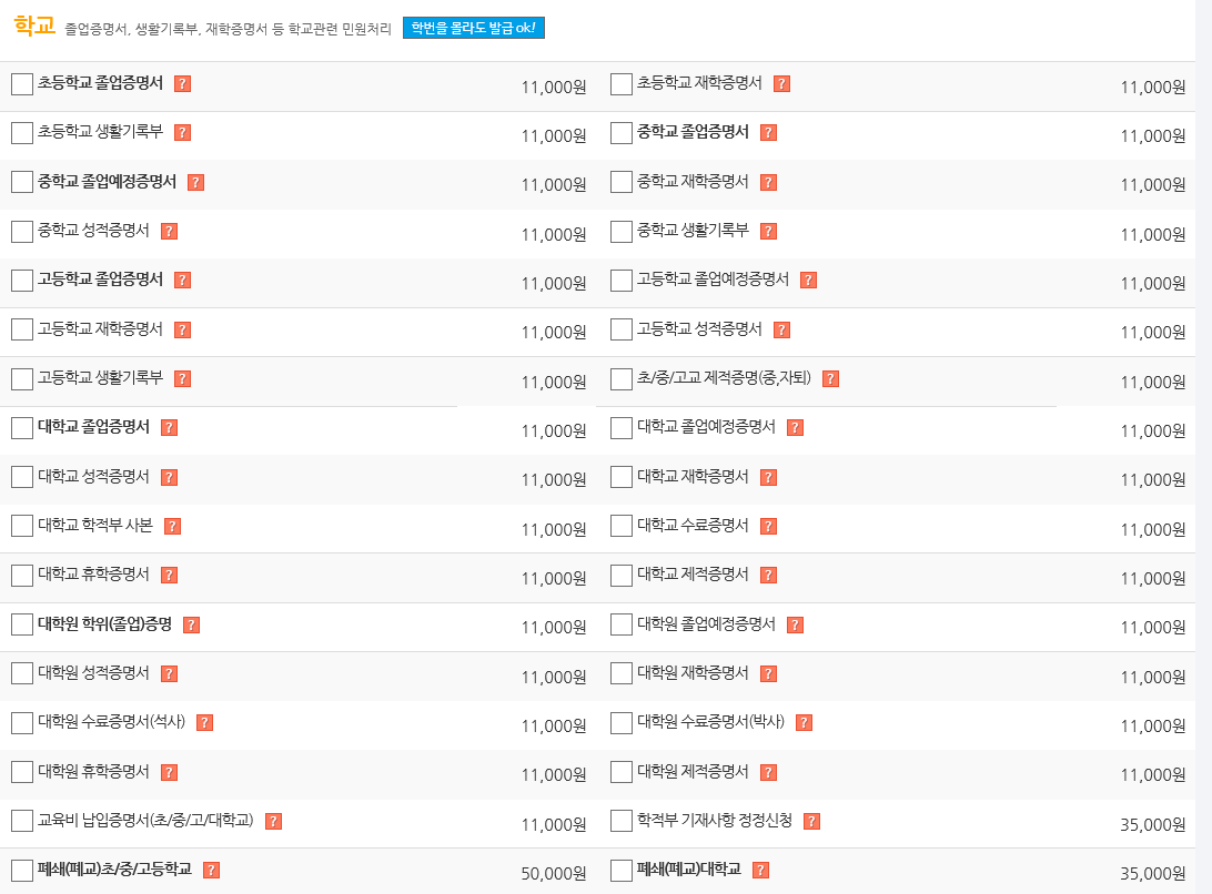 화면을 아래로 내리다보면 학교 항목이 나오고 이 곳에서 초등학교, 중학교, 고등학교, 대학교, 대학원까지 모든 학교의 졸업증명서와, 생활기록부, 재학증명서 등 모든 학교관련 민원처리가 가능합니다. 초등학교 졸업증명서 발급에 드는 수수료는 11,000으로 각 증명서 종류별로 수수료는 상이합니다.