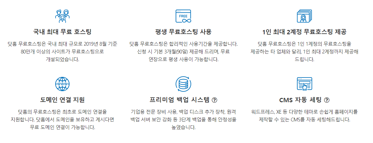 1인당 2계정까지 무료 호스팅 이용이 가능하고 최초 이용기간 90일을 이용하게 되며 만료일 이전에 연장 신청을 하면 제한 없이 평생 무료로 이용이 가능합니다. 서버 공간이나 제약이 있는 부분 때문에 상업적인 사이트로 이용하기 보다는 개인 웹페이지나 테스트용으로 이용하기에 적합합니다.