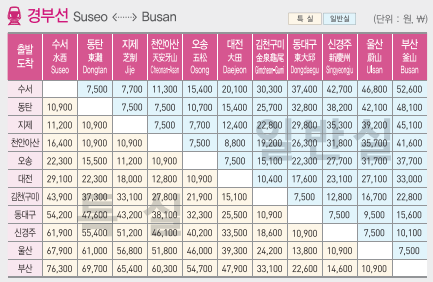 srt 운임가격은 일반실과 특실에 따라 가격 차이가 있습니다. 특실의 경우 좌석간격이 1,060mm로 발을 뻗기에도 공간이 넉넉하고 전좌석 리클라이닝 시트에 좌석마다 전원 콘센트가 준비되어 있는 것이 특징입니다.