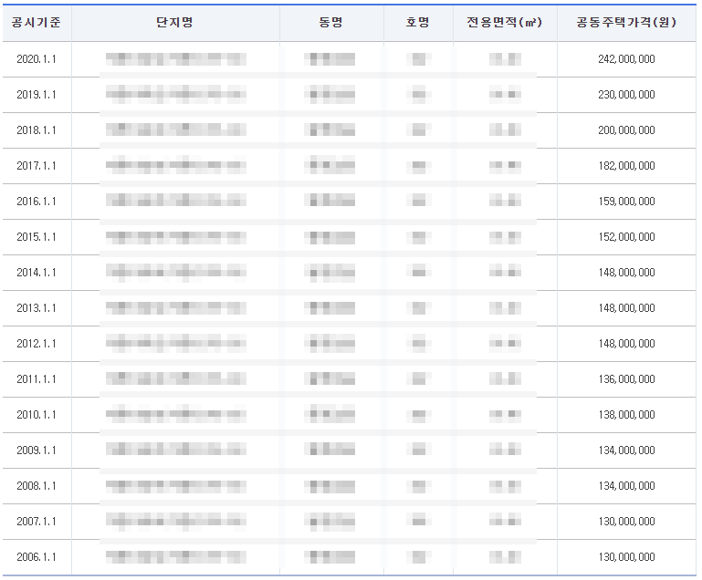 이렇게 아주 간단하고 쉽게 해당 주소지 아파트에 대한 공시지가 결과를 열람할 수 있습니다. 매년 초마다 새로운 가격이 산정되기 때문에 년도별로 가격 추이를 확인할 수도 있습니다.