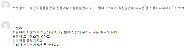 실제로 로봇청소기를 사용하는 분들의 후기를 인터넷에서 찾아보면 경우에 따라 층간소음으로 작동을 꺼리는 분들도 있지만 대체로는 보통의 진공청소기만큼의 소음은 없다는 평가가 많습니다. 로봇청소기의 경우 바퀴가 크고 흡입구가 바닥에서 어느정도 떨어진 상태로 작동하기 때문에 아무래도 일반 청소기보다는 소음 면에서 낫다고 보면 될 듯합니다.