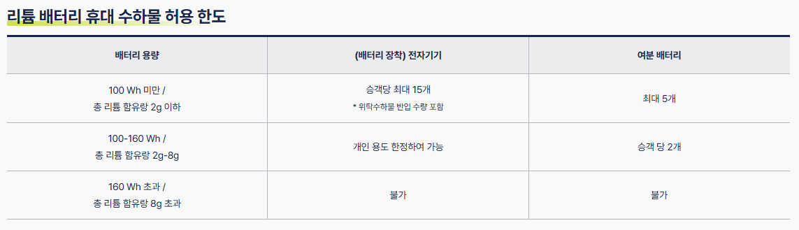 요즘은 휴대가 간편한 거치형 보조배터리도 많이 이용하는데 이 또한 여분 배터리에 해당하기 때문에 이것 역시 인당 휴대 탑승 가능 한도인 5개까지에 포함하여야 합니다.